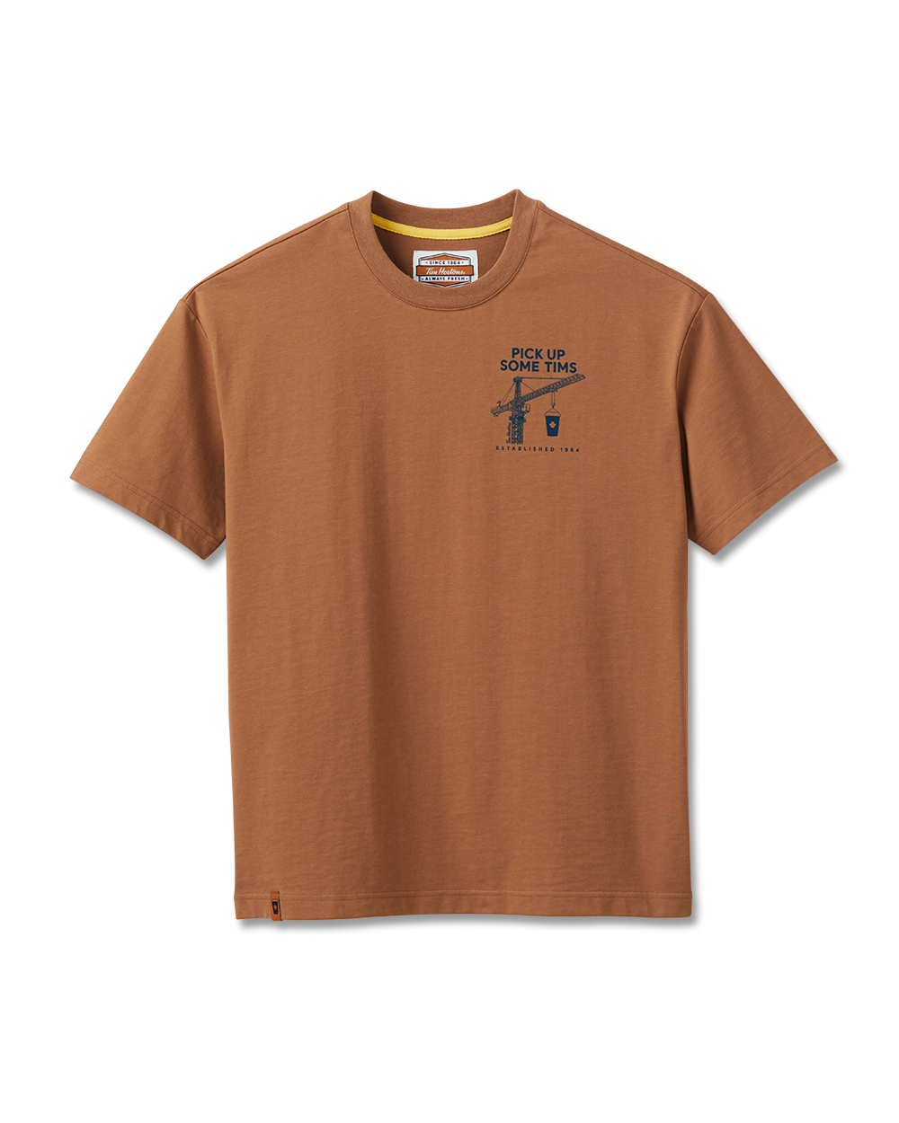 Serving retro flair in a fresh Tims maple colour. This relaxed fit tee features a construction inspired graphic that says exactly what you’re thinking.